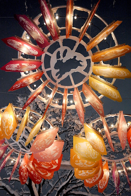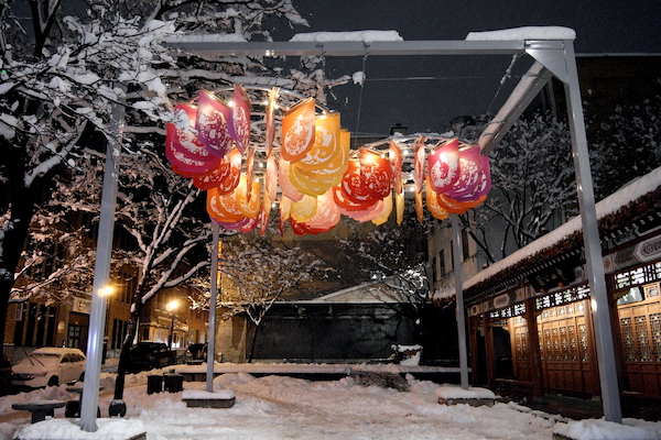 Une famille de dragons, composée d’une multitude de bannières inspirées des découpages traditionnels, s’enroule autour des lampadaires le long de la rue piétonne De La Gauchetière, en commençant par la « queue » du dragon au coin de la rue Saint-Urbain. Les panneaux lumineux et colorés mêlent des motifs traditionnels du papier découpé chinois, tels que des fleurs, des tigres, des lapins, des dragons et d’autres animaux symbolisant la biodiversité et le renouveau de la vie. En suivant le parcours des dragons, les couleurs des panneaux évoluent du rose au jaune, puis à l’orange et au rouge – des couleurs associées au Nouvel An lunaire. Ce voyage de transformation mène jusqu’à la « tête » du dragon, au centre du parc Sun Yat-Sen, où trois anneaux lumineux, formés par les panneaux illuminés, sont suspendus en hauteur. En regardant depuis en dessous, les visiteurs découvrent les formes d’un lapin, d’un nuage et de la lune, célébrant ainsi la fin de l’Année du Tigre en 2022, l’arrivée de l’Année du Lapin en 2023, et une évocation de l’Année du Dragon en 2024.