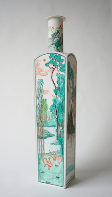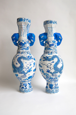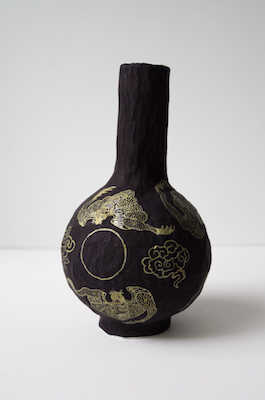 Papier-mâché (Chinese newspaper, wallpaper past w/ fungicide and moisture protection), styrofoam, card, gouache, watercolour, gold marker,